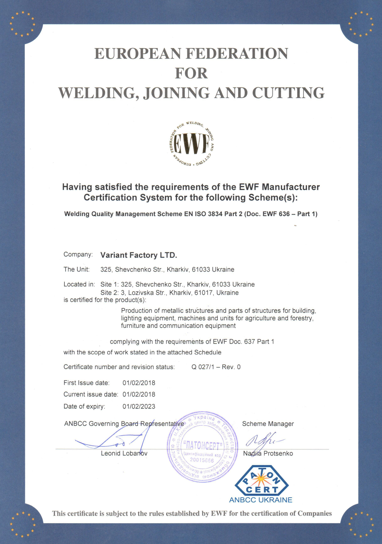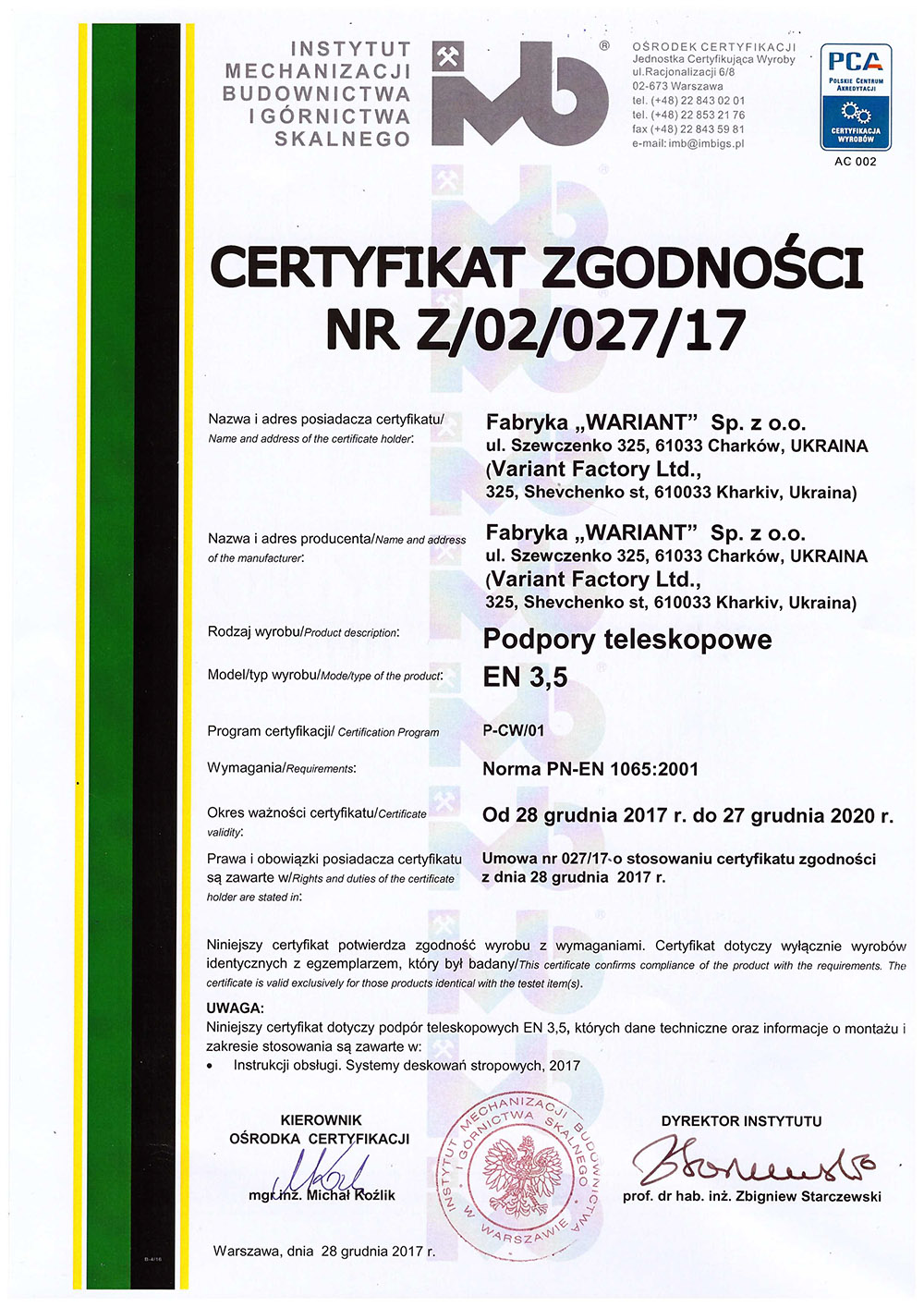 All our products are certified by the certificates of quality management ISO 9001-2001. Many years of experience of the specialists of Variant Factory Ltd help not only to improve all the formwork systems but to design and patent new lines of products.
